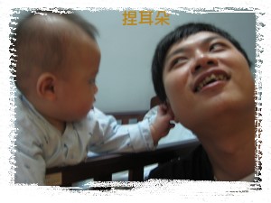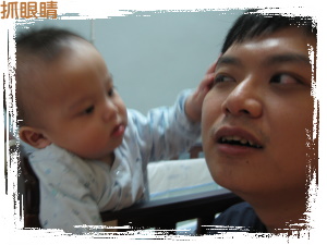 北鼻現在頭好壯壯已經能夠直線爬行自由地前爬 轉身 翻滾 樣樣難不倒他有時後向小猴子般抓著床欄用力搖晃身體既然他已經快到了橫行無阻的階段了許多東西都躲不過他的小手凡經過他小手必留下痕跡口水啦~指甲痕啦~~瘀青等等不過損失最慘重的莫過於爸比的眼鏡吧已經換了一副這次可要小心翼翼北鼻上身可少不了抓頭髮 捏耳朶 摳眼睛等行徑喔可憐的爸比犧牲最大啦! 為了滿足寶貝的好奇心爸比只好忍痛"獻"耳"獻"眼了小傢伙還會開心地大笑哩!就這樣大頭榮升北鼻最愛玩具~南吧ONE